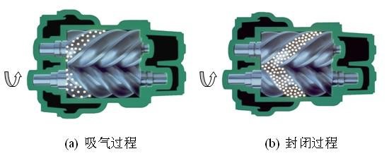 螺桿式空氣壓縮機(jī)的工作原理:電機(jī)驅(qū)動(dòng)轉(zhuǎn)子,主從轉(zhuǎn)子的齒溝空間在轉(zhuǎn)至進(jìn)氣端壁開(kāi)口時(shí),其空間大,外界的空氣充滿其中,當(dāng)轉(zhuǎn)子的進(jìn)氣側(cè)端面轉(zhuǎn)離了殼之進(jìn)氣口時(shí),在齒溝間的空氣被封閉在主、從轉(zhuǎn)子與機(jī)殼之間,完成吸氣過(guò)程。在吸氣結(jié)束時(shí),主、從轉(zhuǎn)子齒峰與機(jī)殼形成的封閉容積隨著轉(zhuǎn)子角度的變化而減少,并按螺旋狀移動(dòng),此為壓縮過(guò)程。在輸送過(guò)程中,容積不斷減少,氣體不斷被壓縮,壓力提高,溫度升高,同時(shí),因氣壓差而變成霧狀的潤(rùn)滑油被噴入壓縮腔,從而達(dá)到壓縮、降低溫度密封和潤(rùn)滑的作用。當(dāng)轉(zhuǎn)子之封閉齒峰旋轉(zhuǎn)到與機(jī)殼排氣口相遇時(shí),被壓縮的空氣開(kāi)始排放,直到齒峰與齒溝的吻合面移至排氣端面,此時(shí)齒溝空間為零,即完成排氣過(guò)程。與此同時(shí),主從轉(zhuǎn)子的另一對(duì)齒溝已旋轉(zhuǎn)至進(jìn)氣端,形成大空間,開(kāi)始吸氣過(guò)程,由此開(kāi)始一個(gè)新的壓縮循環(huán)。